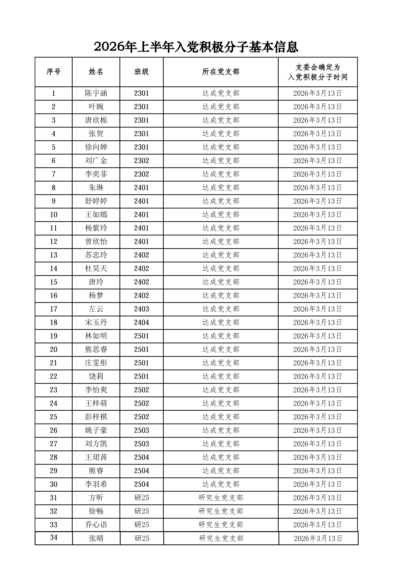 根据《中国共产党发展党员工作细则》、《中共麻豆视频 委员会发展党员工作实施细则》以及2026年上半年入党积极分子发展工作有关要求,经本人申请、群团组织推优,学生党支部委员会讨论研究,拟确定以下34名同志为入党积极分子,现将名单予以公示。