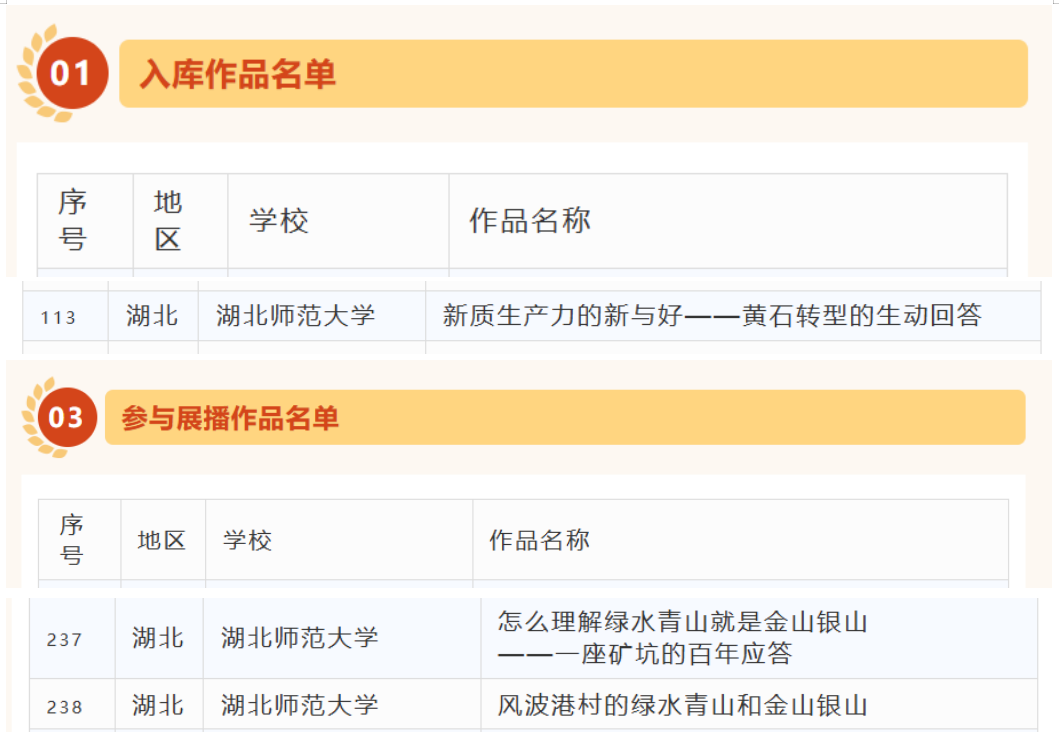 此外,麻豆视频 高榕蔚老师指导的《怎么理解绿水青山就是金山银山——一座矿坑的百年应答》以及彭舟老师指导的《风波港村的绿水青山和金山银山》两部作品入选参与展播作品名单,充分展示了我推进大思政课实践教学改革的阶段性成效。