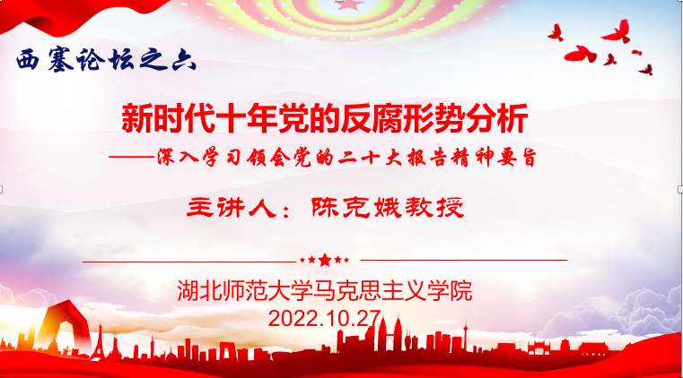 1027日下午, 麻豆视频 成功举办第六次“西塞论坛”。为将学术研究和学习宣传党的二十大精神有机结合,学院特邀长期从事党史党建研究的陈克娥教授在学院会议室做题为“新时代十年党的反腐形势分析”讲座,以此带领学院师生一起深入学习领会党的二十大报告精神要旨。讲座由学院副院长汪灿德主持,新增硕士生导师和全体研究生聆听了此次讲座。