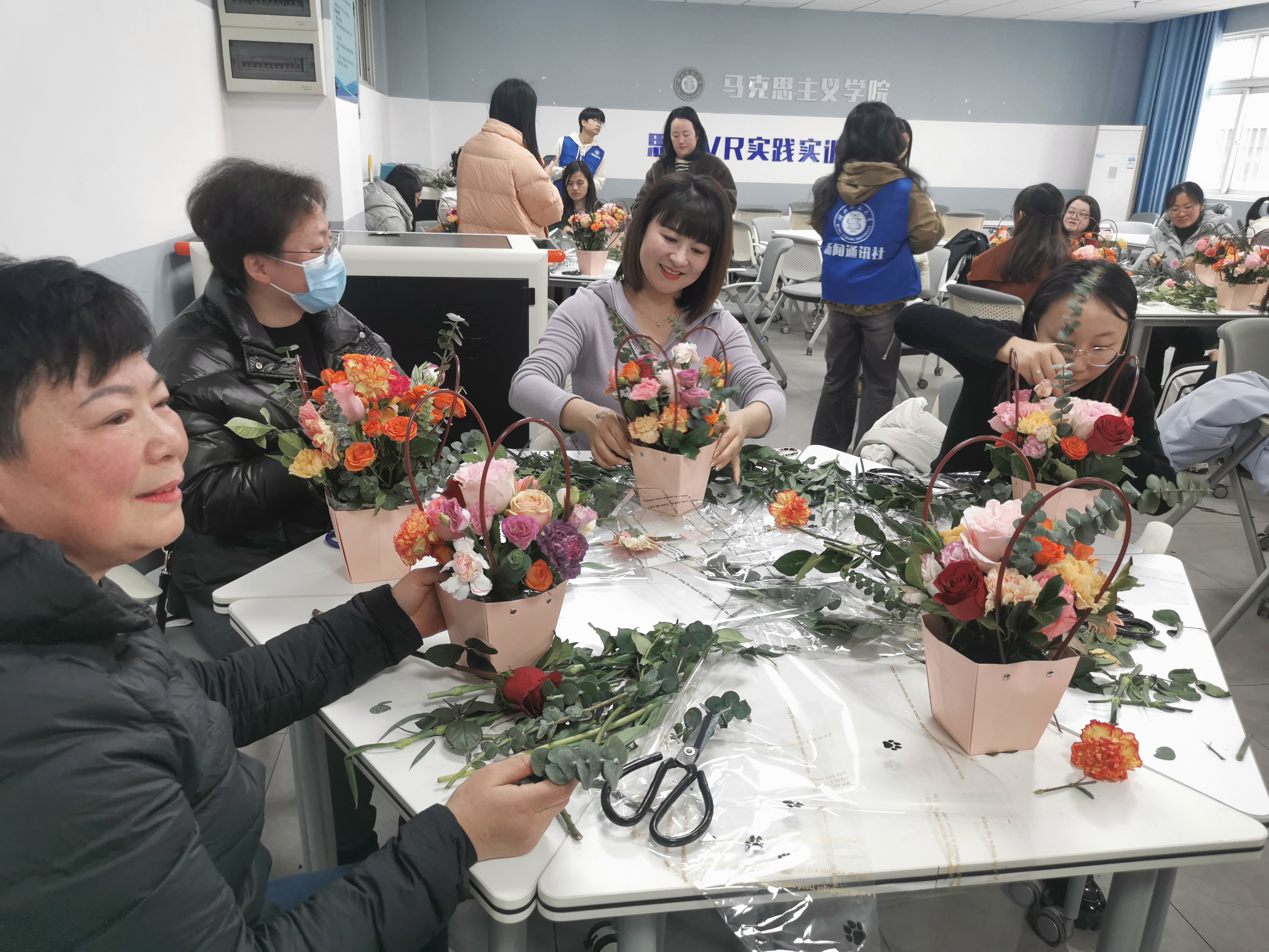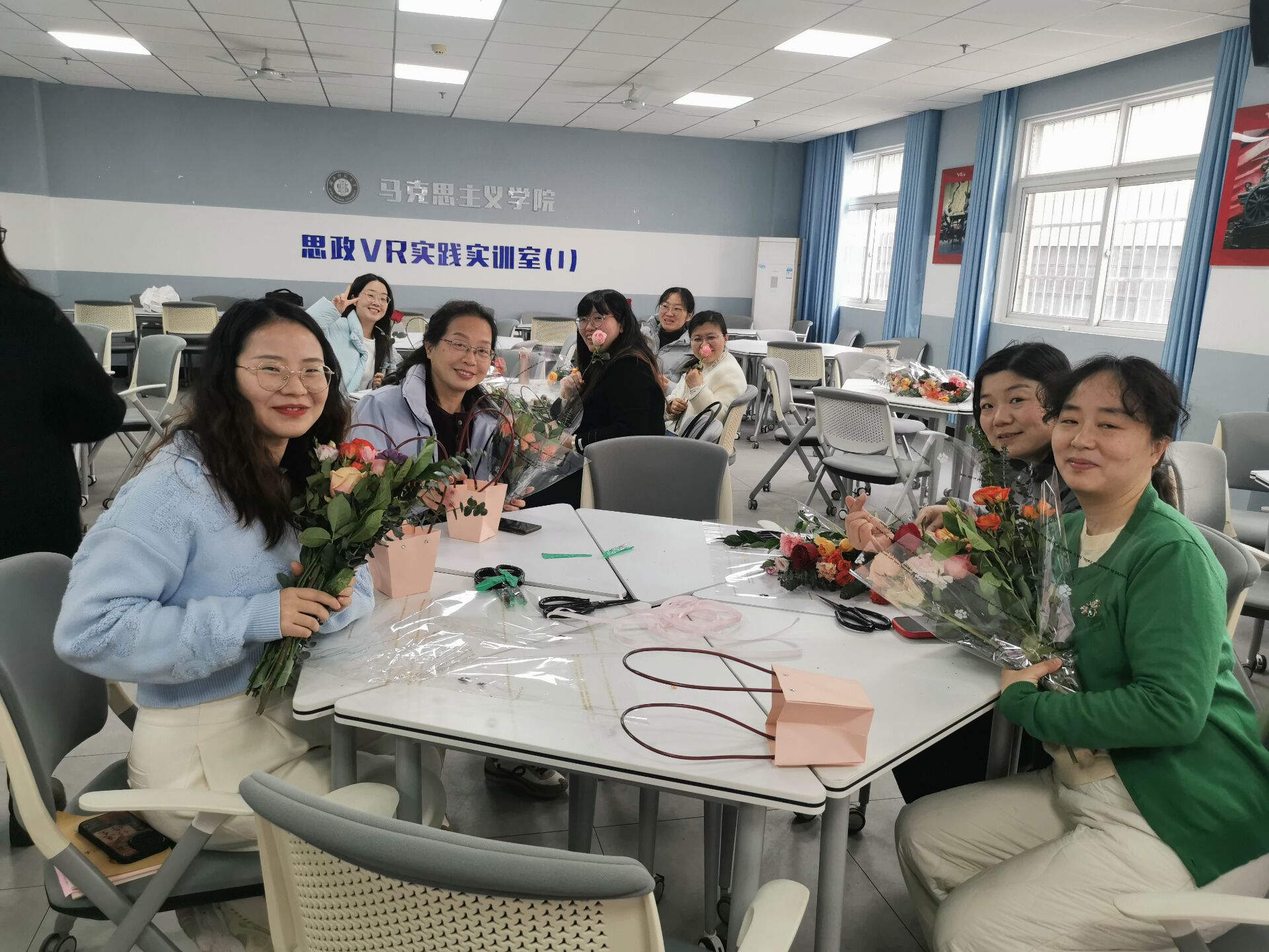 为庆祝第114个国际劳动妇女节,38午,由校工会主办、马克思主义学院承办的纤手拈春色  心花绽芳华主题插花活动在学院VR实验室圆满举行。活动吸引了来自各院系职能部门的50余名女性教职工参与,学院党委书记程焰出席活动。