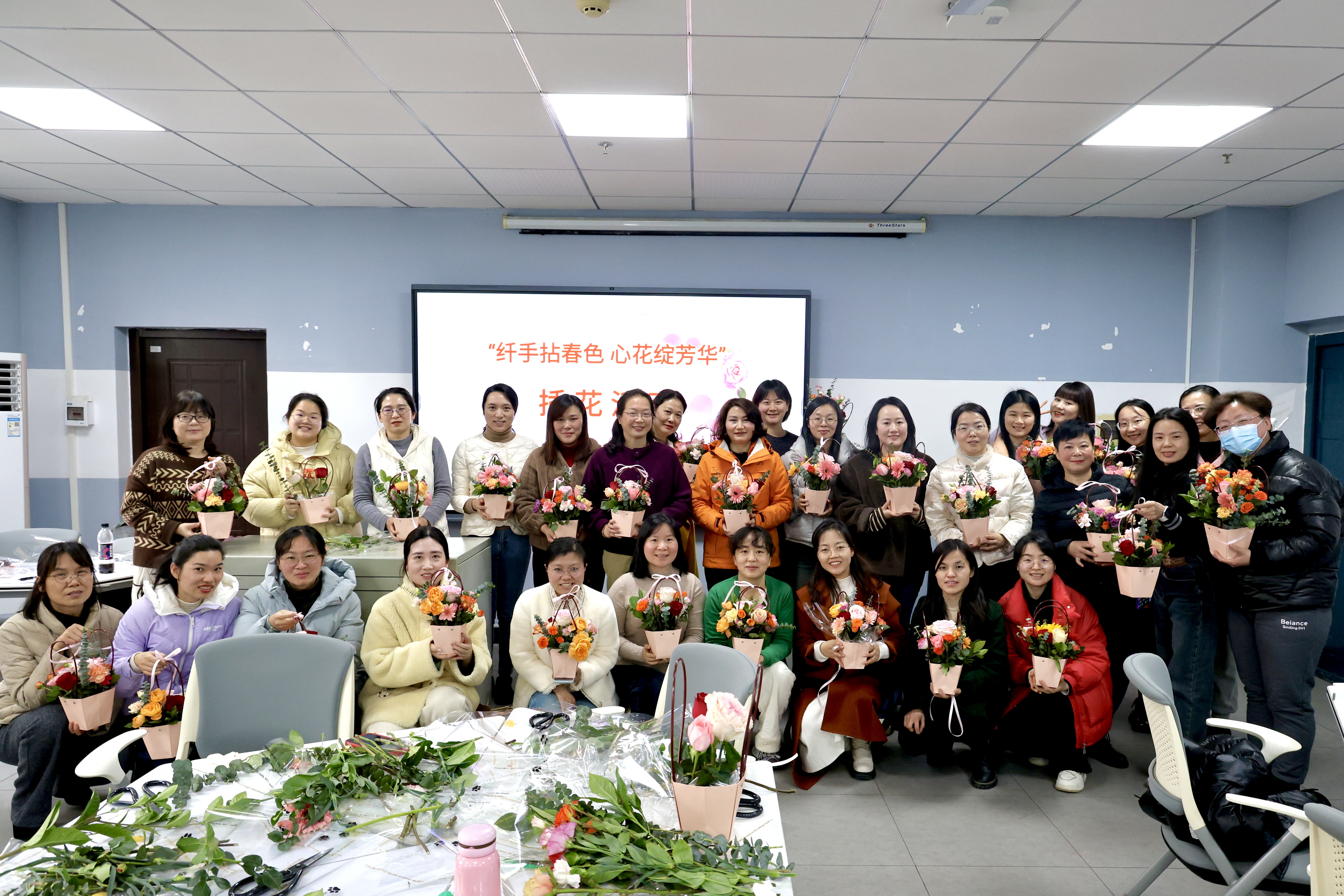 活动结束后,一篮篮承载着巧思的花艺作品被带往各办公室,为校园增添了一抹动人的春色。此次活动不仅提升了教职工的艺术修养,更通过指尖艺术传递出新时代女性自信优雅的精神风貌。(撰稿:张磊