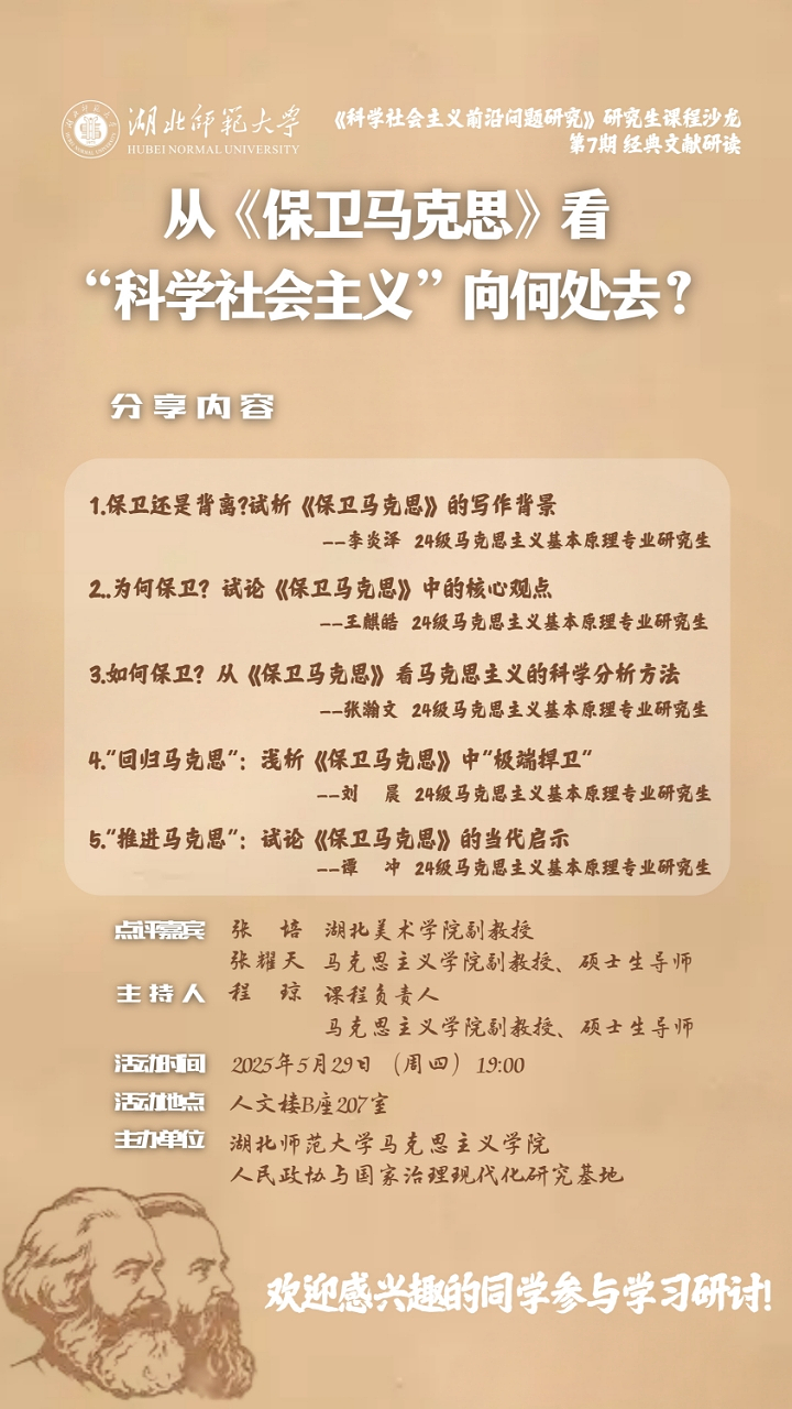 为系统性地促进研究生学术素养的全面发展,增强研究生从经典文献中提炼思想精髓、洞察学科前沿趋势的能力,锤炼研究生卓越思维能力以及提升研究生专业素养,麻豆视频 特依托研究生专业课程《科学社会主义前沿问题研究》开展系列研究生学术活动,并定于近期开展第7期研究生课程沙龙。具体事项如下: