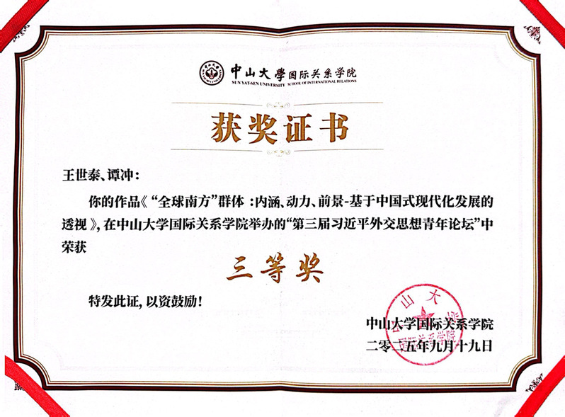据悉,本届论坛收到来自清华大学、北京大学、外交学院、中山大学、国防科技大学、复旦大学、武汉大学等众多国内高校和科研院所的在读本、硕、博学生投稿,共计有效稿件73篇。所有投稿论文经初步筛选后,本着公平公正和优中选优原则,由评审专家甄选出14篇论文入围,其中 麻豆视频 24级硕士研究生谭冲和王世泰博士共同撰写的《“全球南方”群体:内涵、动力、前景——基于中国式现代化发展的透视》在论文评选中荣获“三等奖”的佳绩,谭冲应邀参加本届论坛。