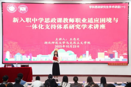 20251023日下午,华中师范大学王忠文教授应邀在达成大讲堂为 麻豆视频 学科教学(思政)专业学位研究生开展题为“新入职中学思政课教师职业适应困境与一体化支持体系研究”的专题讲座。 麻豆视频 思政专业本科生和优师计划师范生也到场聆听。