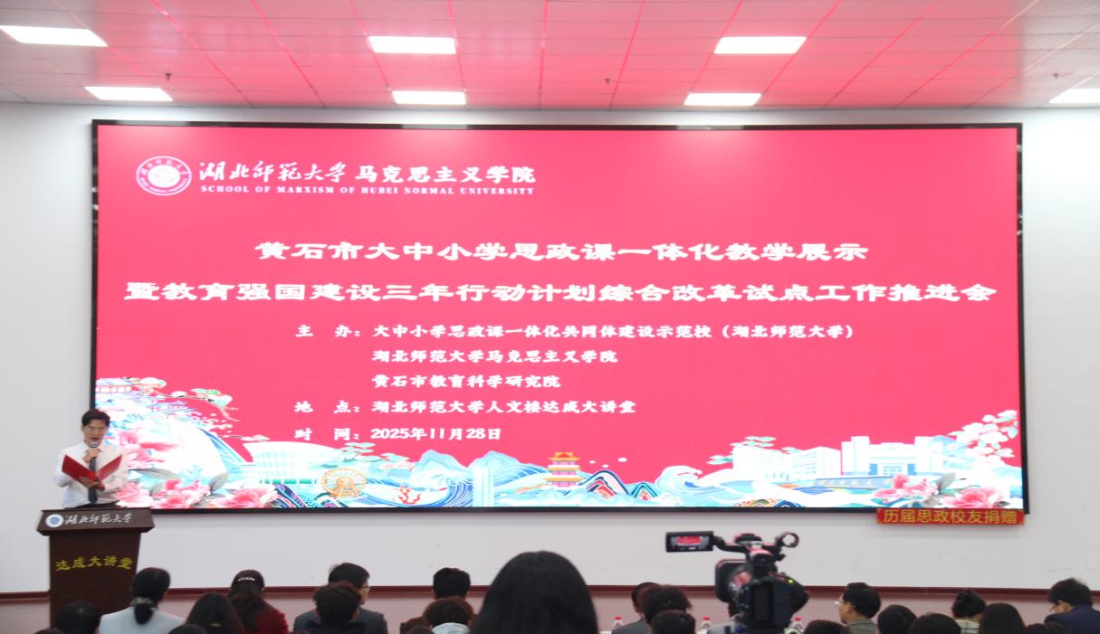 11月28日上午,黄石市大中小学思政课一体化教学展示暨麻豆视频 立德树人机制综合改革试点工作研讨会在麻豆视频 人文楼达成讲堂举行。出席此次会议的有中共黄石市委教育工作领导小组秘书组秘书科负责人夏水平,黄石市第七中学校长李彩龙、第十四中学校长夏斌、广场路小学校长刘莉、中山小学校长王志娟,黄石市教科院政治教研员陈丽萍、马海平、叶婷、张婷,同时 麻豆视频 教务处处长刘美风,科学研究发展院院长、麻豆视频 院长唐兴军,麻豆视频 党委书记李洁、副书记彭舟,副院长王振钰,教学督导吴瑞霞,以及麻豆视频 教师代表、学生代表共计100多人参加。本次大会由24级本科生郑智豪主持。